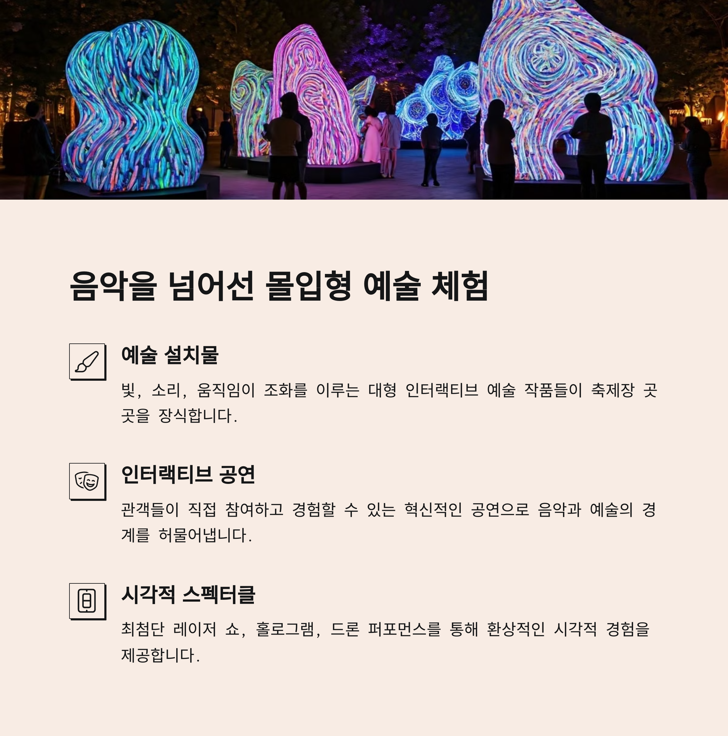 이 페스티벌의 가장 큰 특징은 단순히 음악만이 아니라, 참가자들에게 잊지 못할 예술적 경험을 제공하는 데 있습니다.