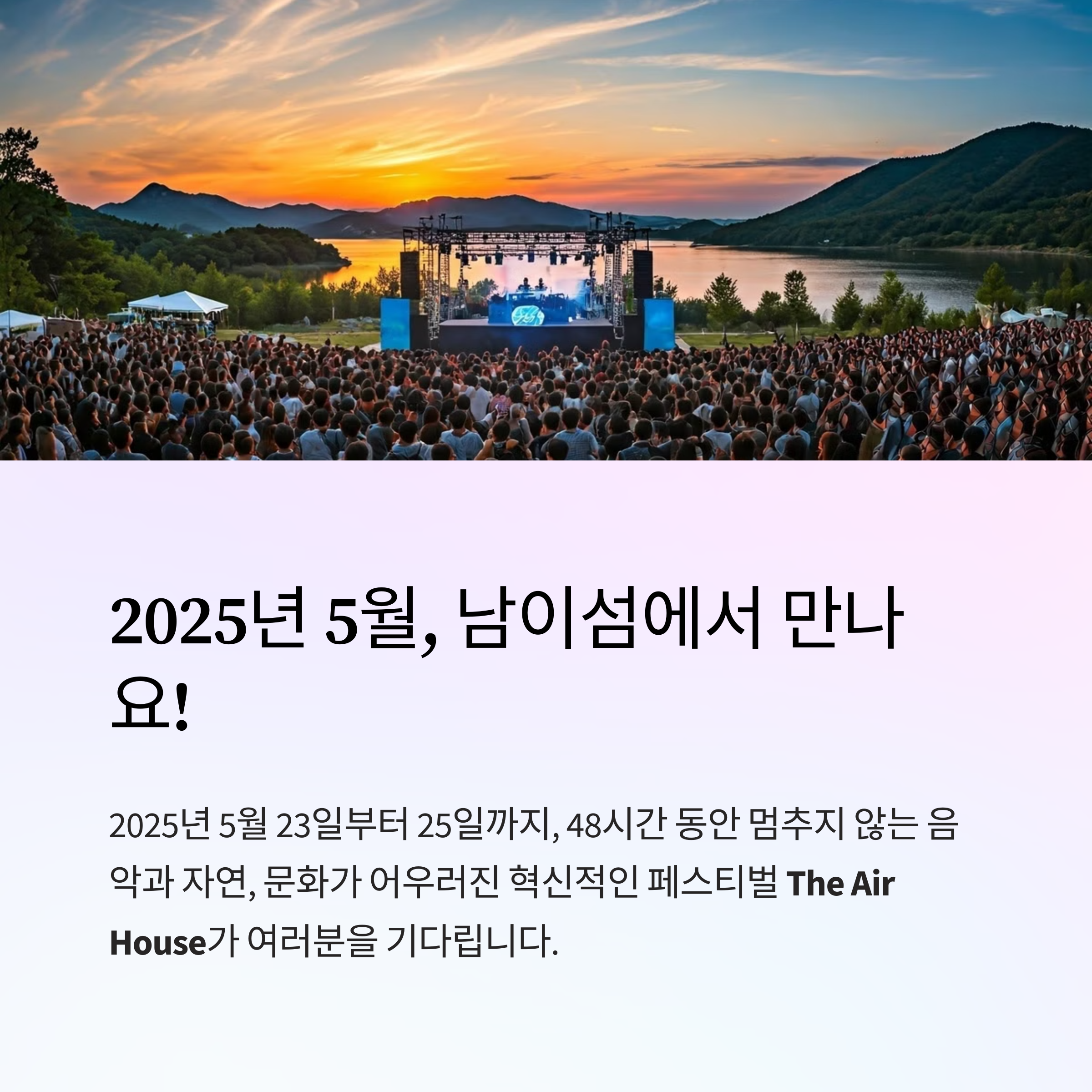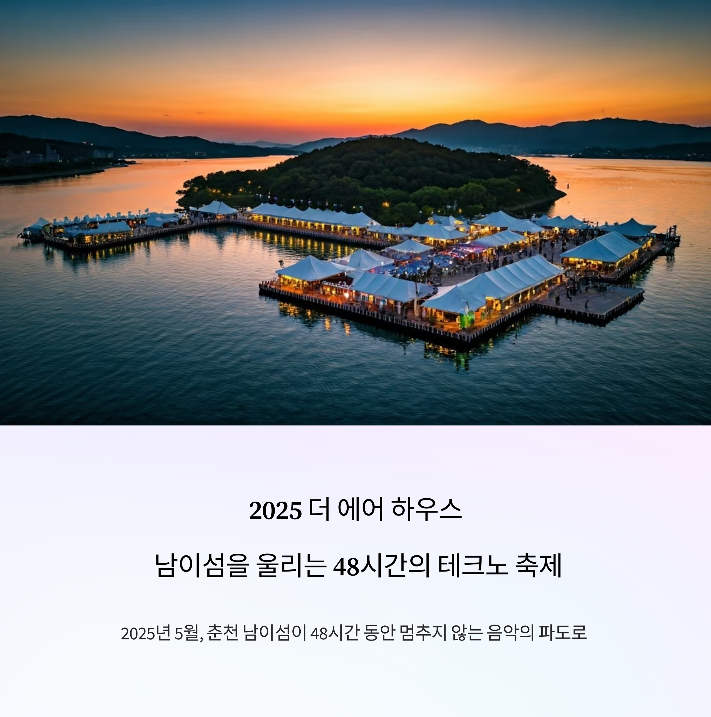 오늘은 춘천 남이섬에서 열리는 세계적인 테크노 음악 페스티벌, The Air House에 대해 알려드릴게요.