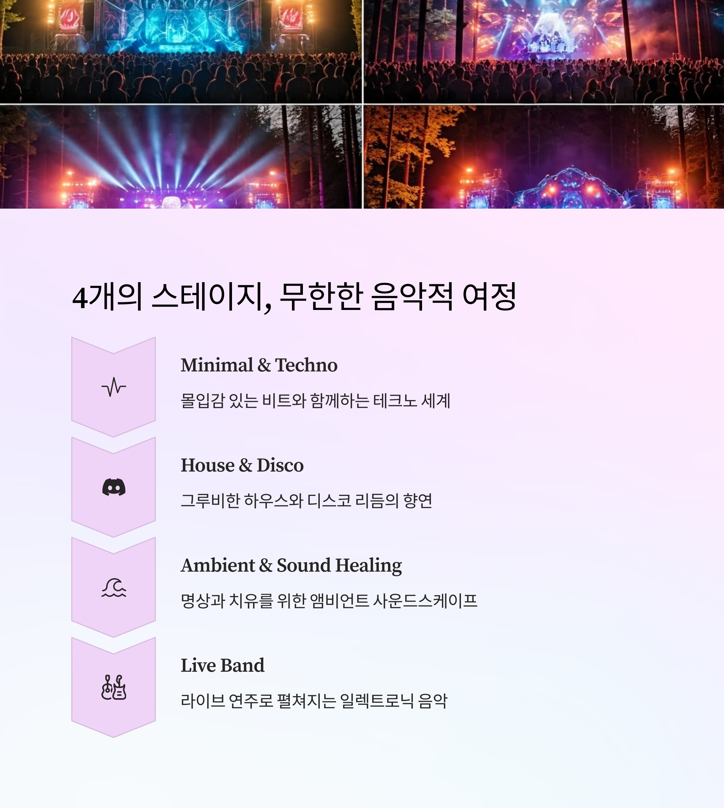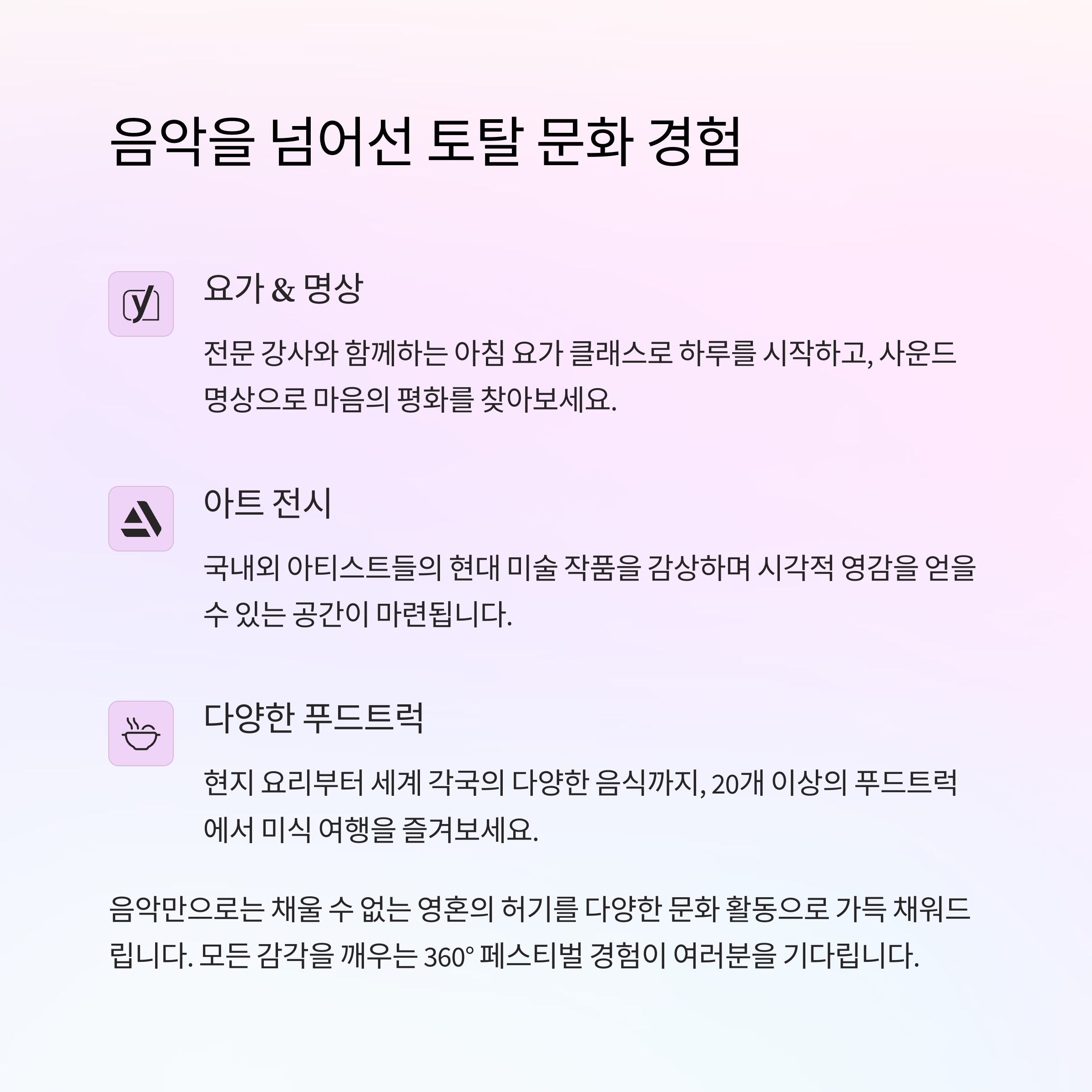 또한, 숲 속 산책과 독특한 아트 전시를 통해 음악 외의 다양한 경험을 제공합니다.