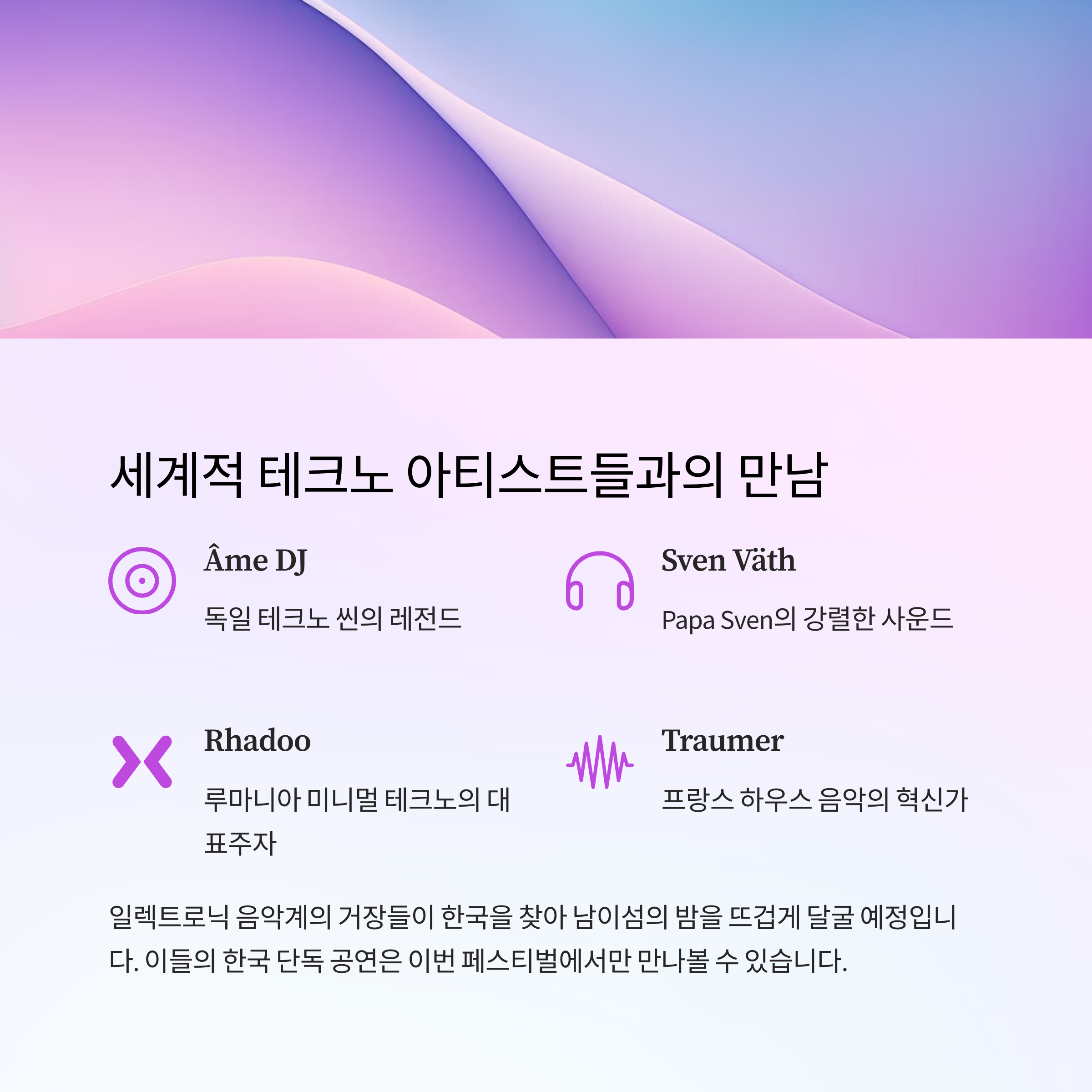 이 페스티벌의 라인업에는 Sven Väth, Âme DJ, NICOLAS LUTZ 등 전 세계에서 주목받는 아티스트들이 포함되어 있습니다. 음악은 48시간 넘게 끊임없이 이어지는 특별한 프로그램을 통해 깊이 있는 몰입감을 선사합니다.
