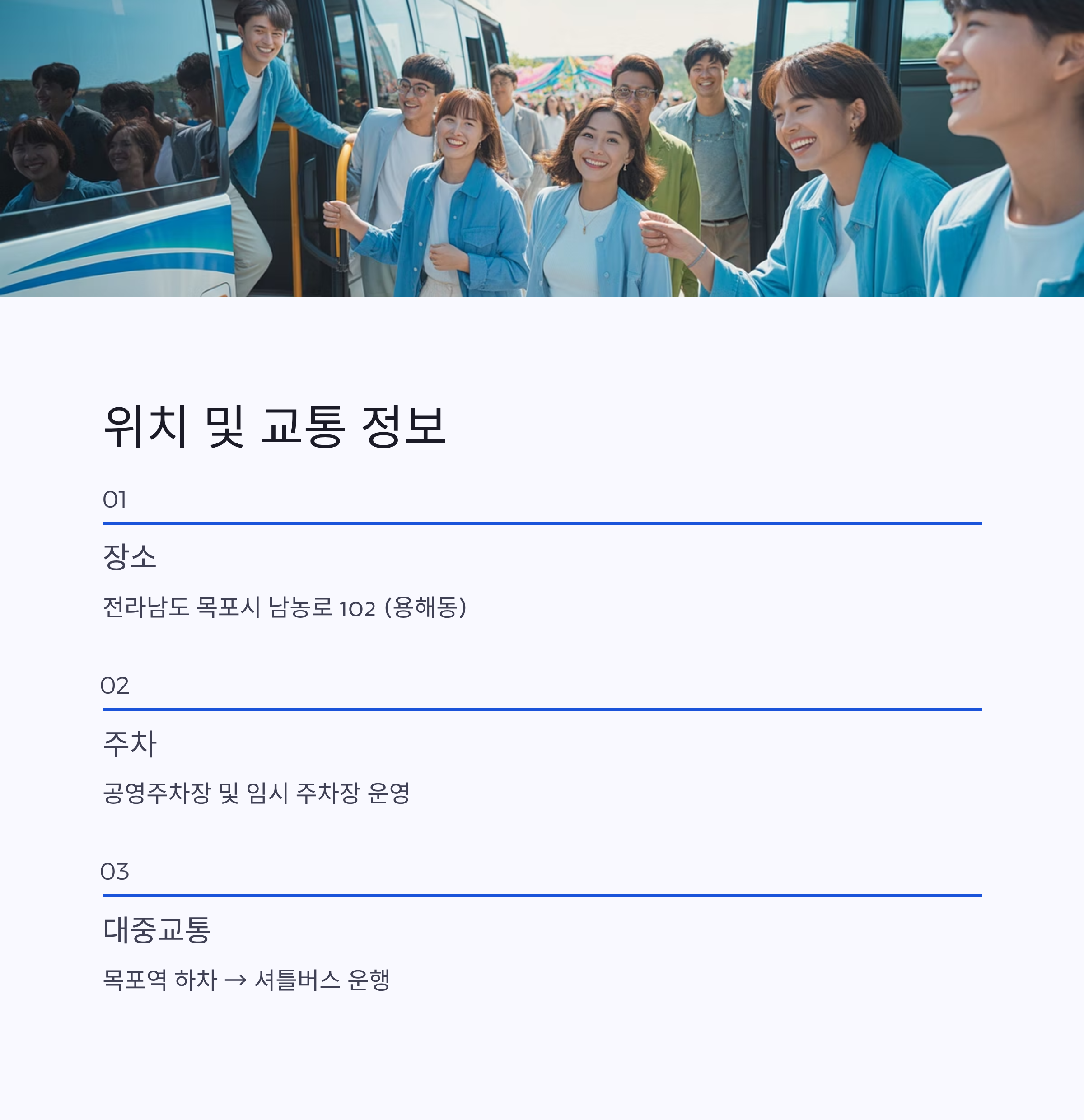 | 대중교통 | 목포역 하차 → 셔틀버스 운행 예정 |