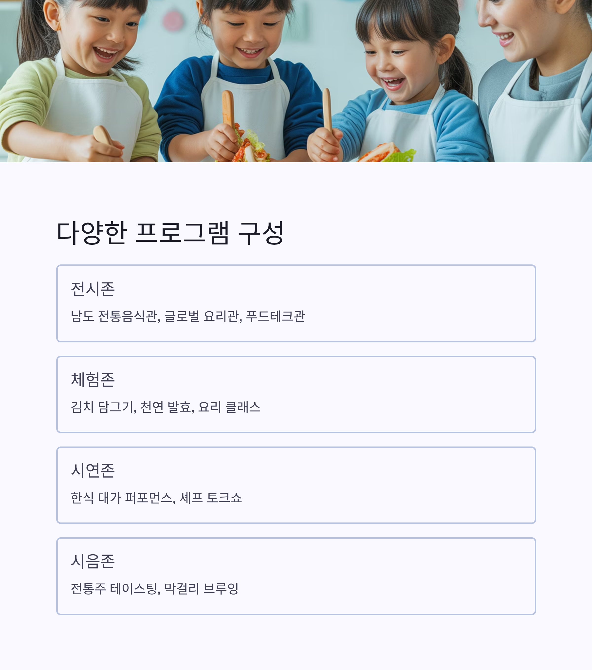 | 체험존 | 남도 김치 담그기, 천연 발효 체험, 요리 클래스 |