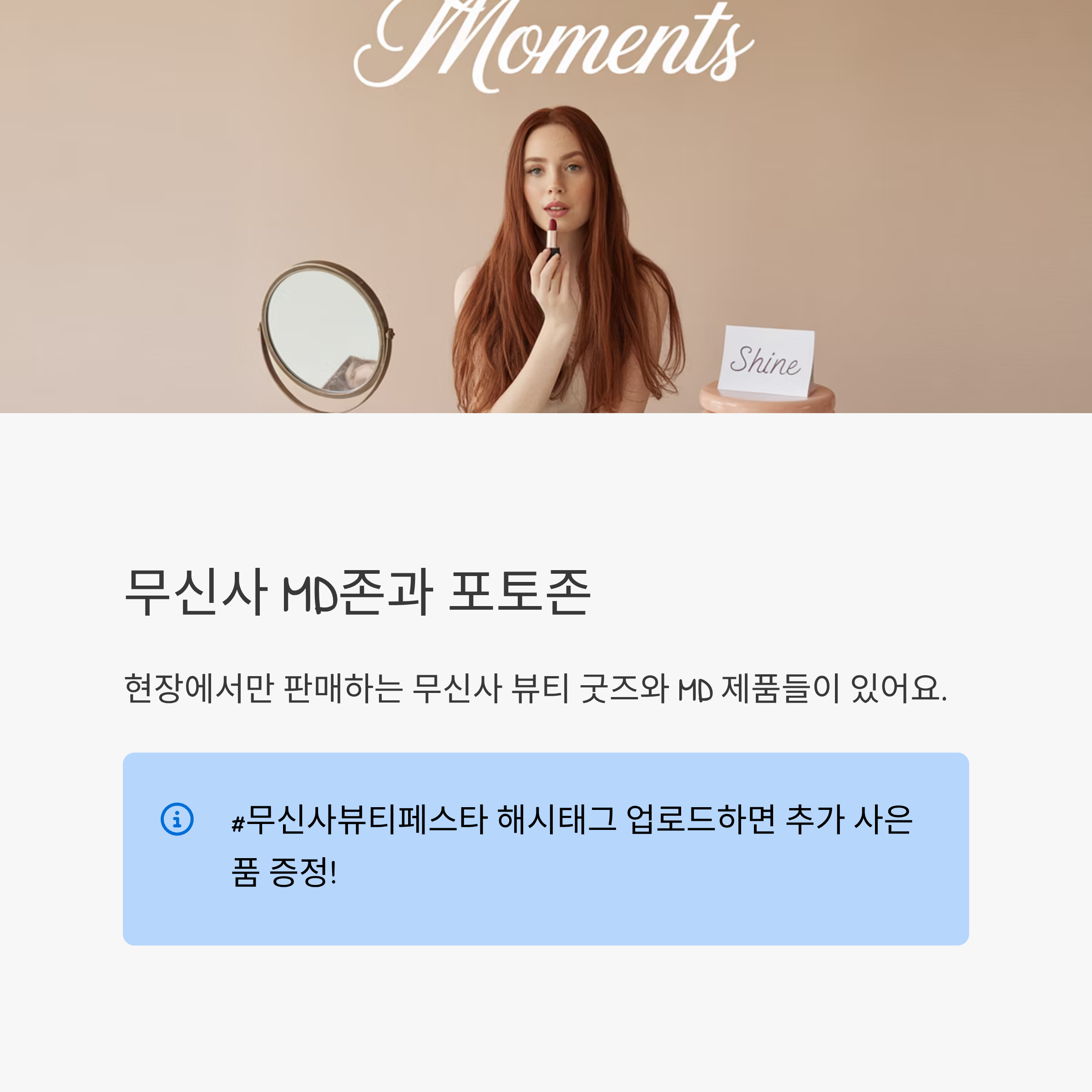 포토존에서 촬영 후 #무신사뷰티페스타 해시태그 업로드하면 추가 사은품 주는 부스도 있었어요!