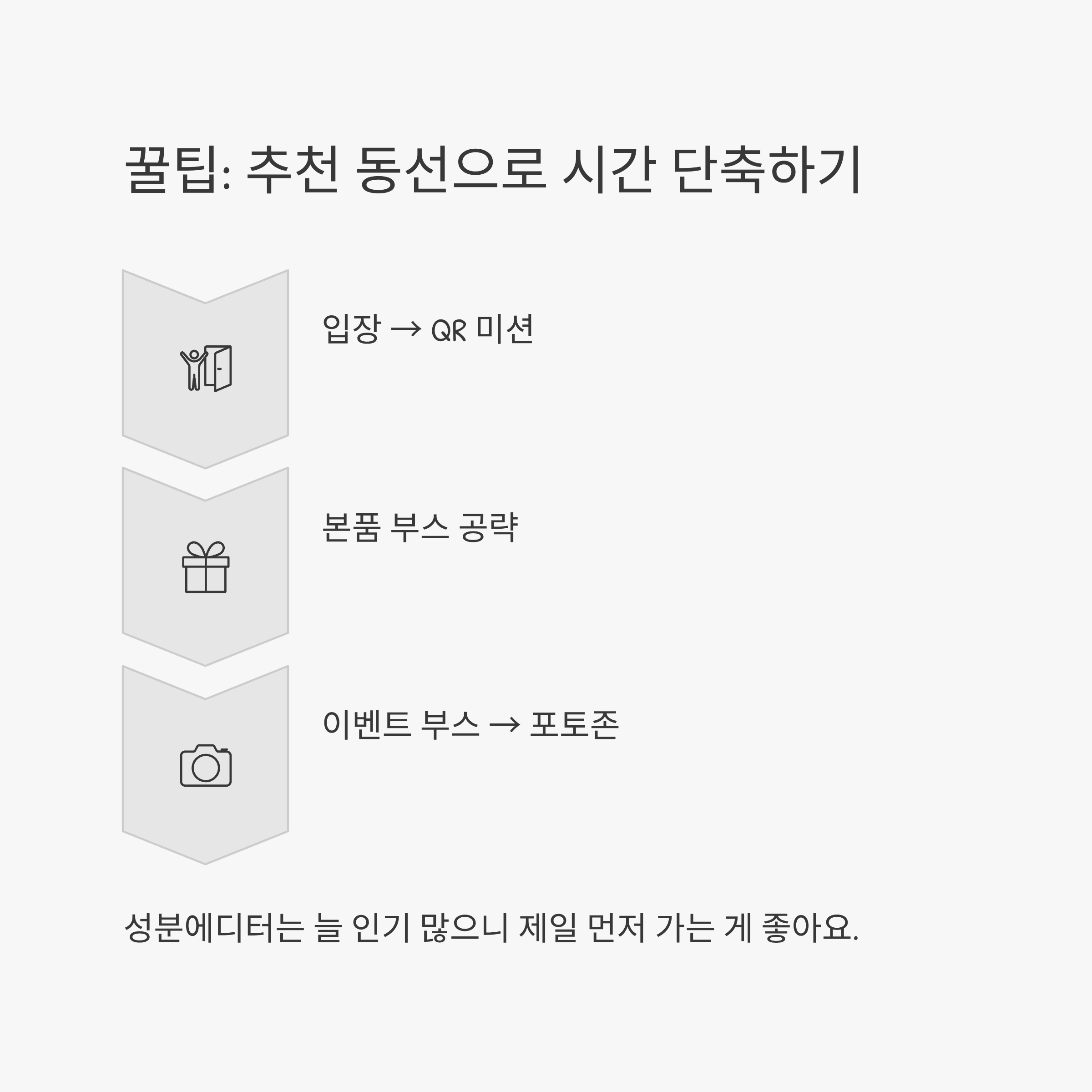 입장 → QR 미션 → 본품 부스 공략 → 룰렛/이벤트 부스 참여 → 포토존 → 퇴장 전 추가 미션