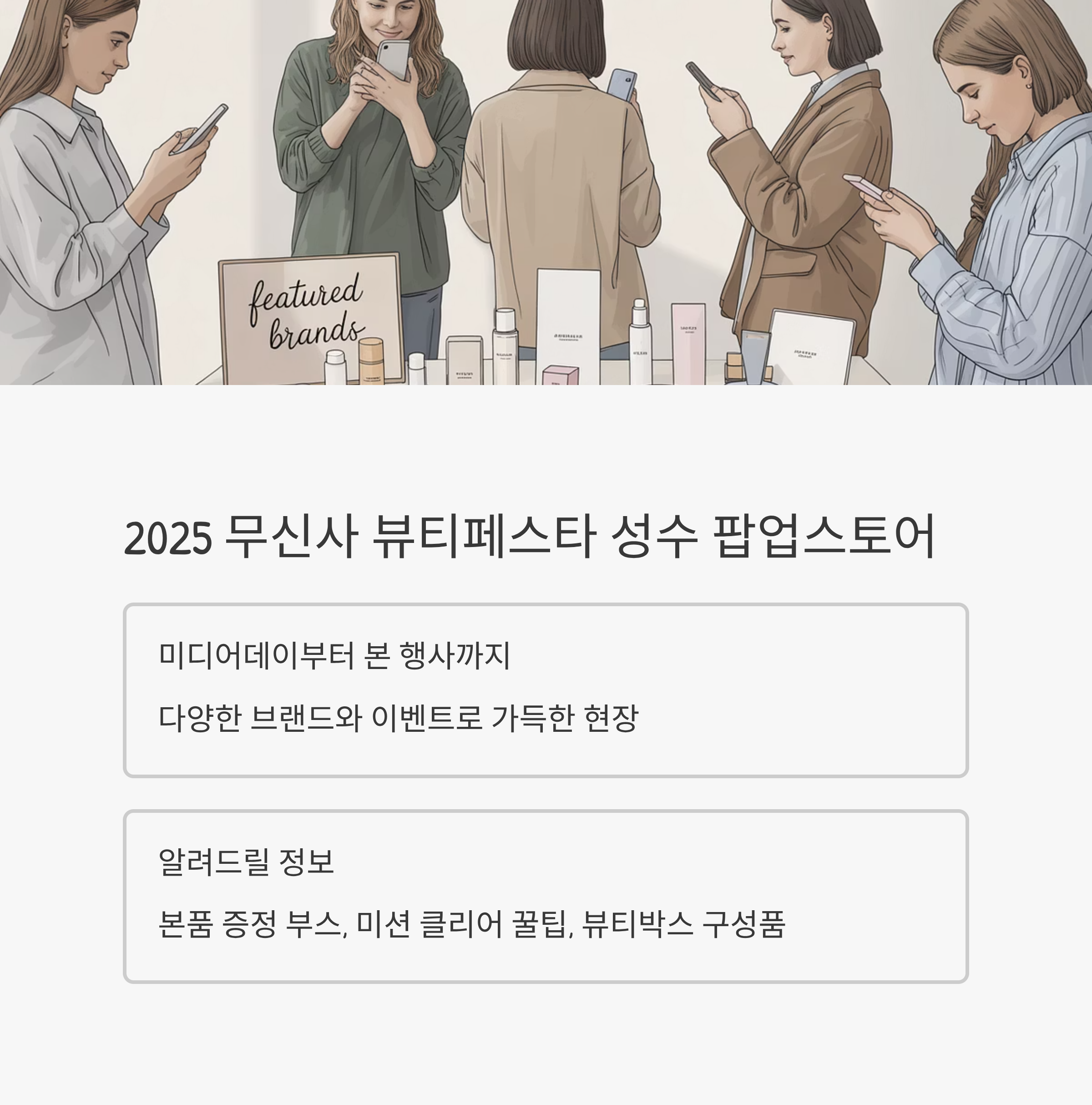 올해도 어김없이 돌아온 2025 무신사 뷰티페스타 성수 팝업스토어! 미디어데이부터 본 행사까지 다양한 브랜드와 이벤트로 가득했던 현장을 직접 다녀왔습니다. 특히 많은 분들이 궁금해하는 본품 증정 부스, 미션 클리어 꿀팁, 그리고 뷰티박스 구성품까지 생생한 후기와 함께 전부 정리해 드릴게요.