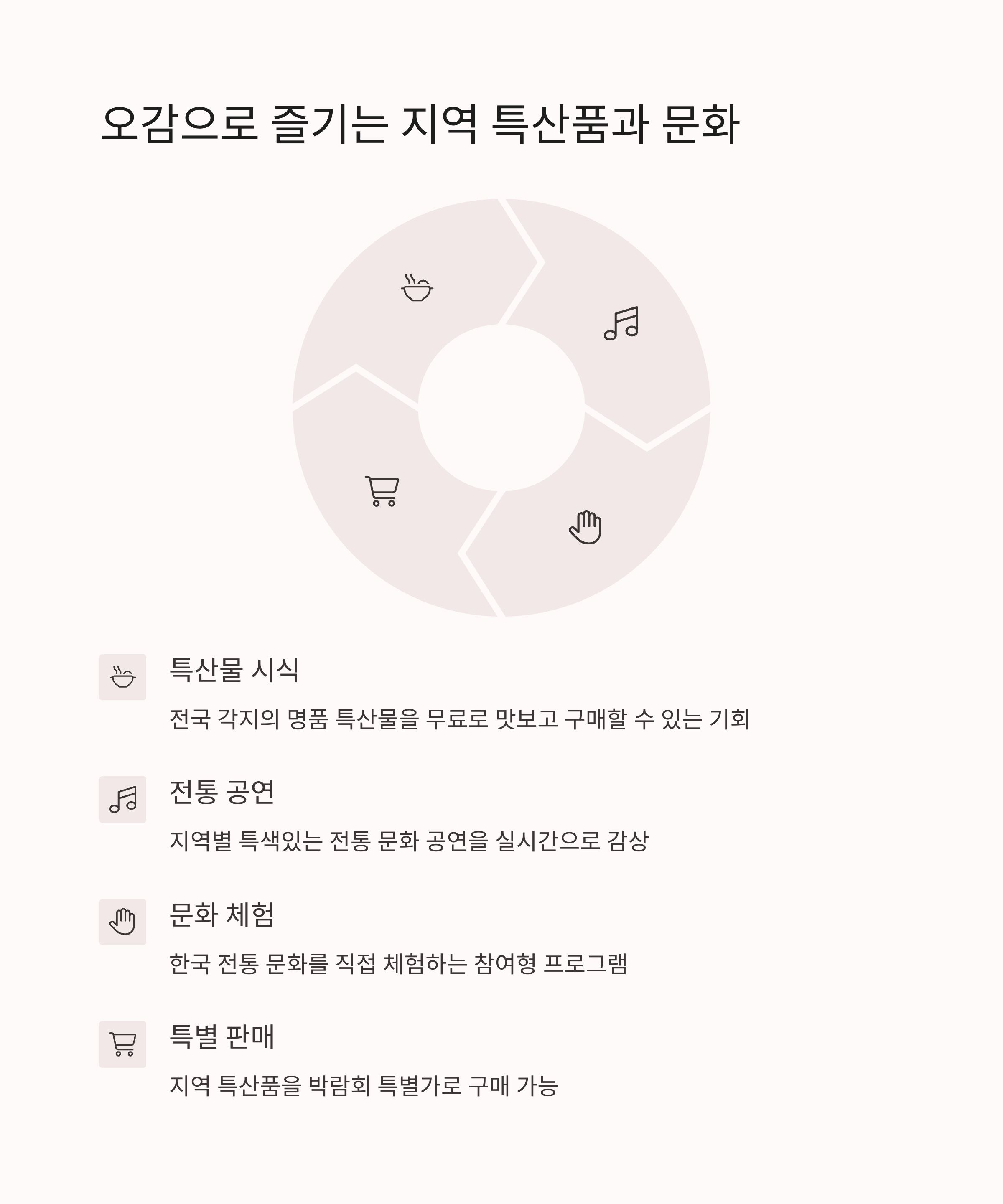 전시 부스와 무대 활용 프로그램은 신규 상품 및 지역 축제를 효과적으로 홍보할 수 있는 채널입니다.
