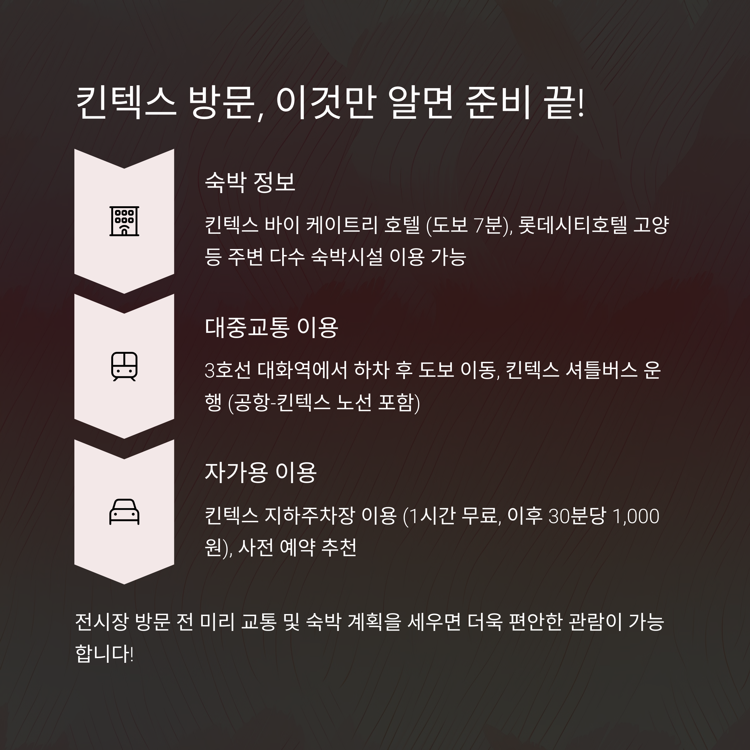| 킨텍스 행사장은 방문객의 편의를 최대한 고려하여 다양한 교통 및 주차 시설을 제공합니다. 자가용 방문객을 위한 대규모 주차장이 총 4곳에 마련되어 있으며, 약 5,000대의 차량을 수용할 수 있습니다. 대중교통 이용객을 위해 경의중앙선 탄현역과 일산역에서 행사장까지 연결되는 셔틀버스가 운영됩니다. 근처 숙소에서 도보로 접근 가능한 거리이기에 멀리서 온 방문객을 위한 배려도 포함됩니다. 교통 혼잡을 피하려면 사전에 셔틀버스 시간표를 확인하거나 일찍 도착하는 것이 좋습니다. |