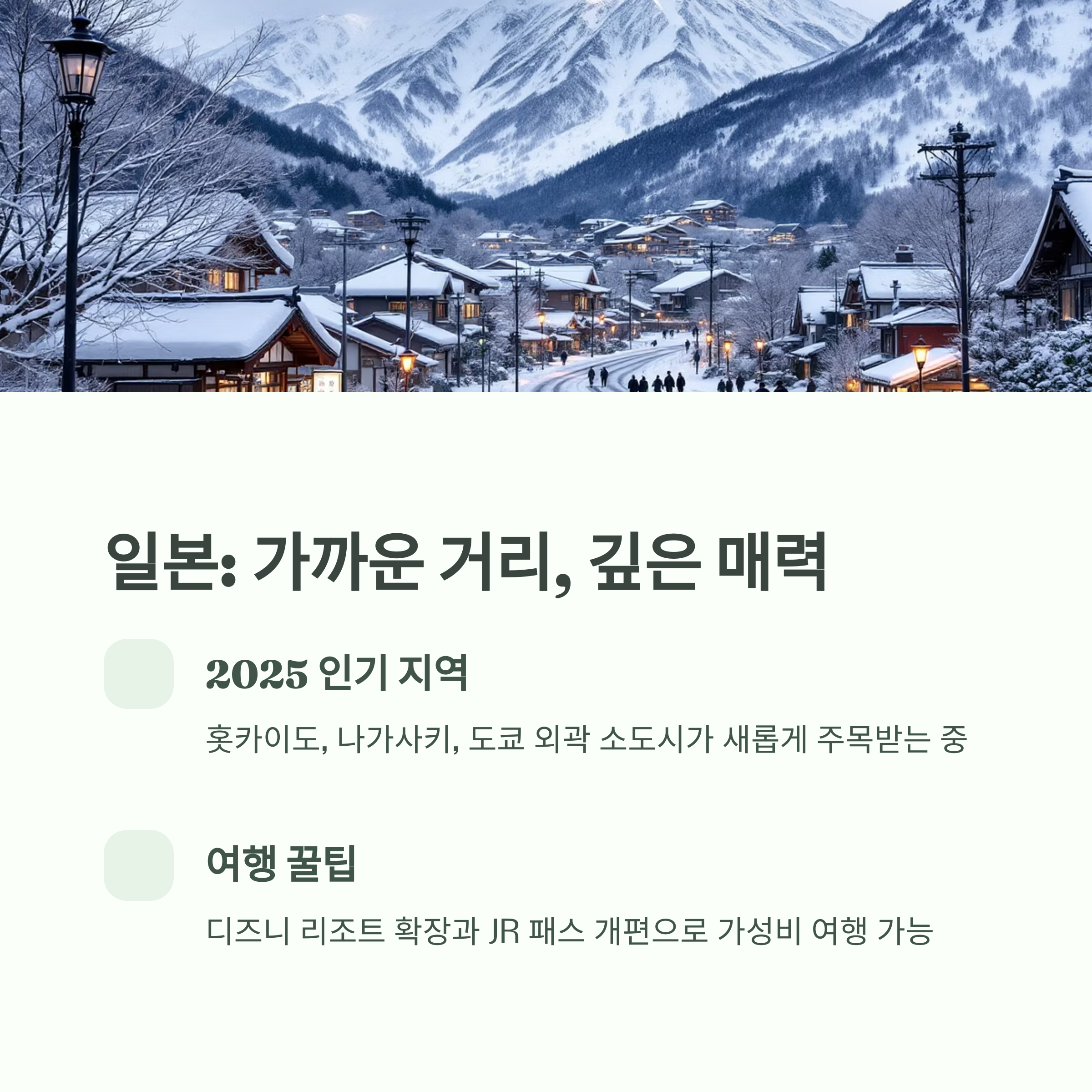 2025년은 홋카이도, 나가사키, 도쿄 외곽의 소도시 여행이 인기입니다.