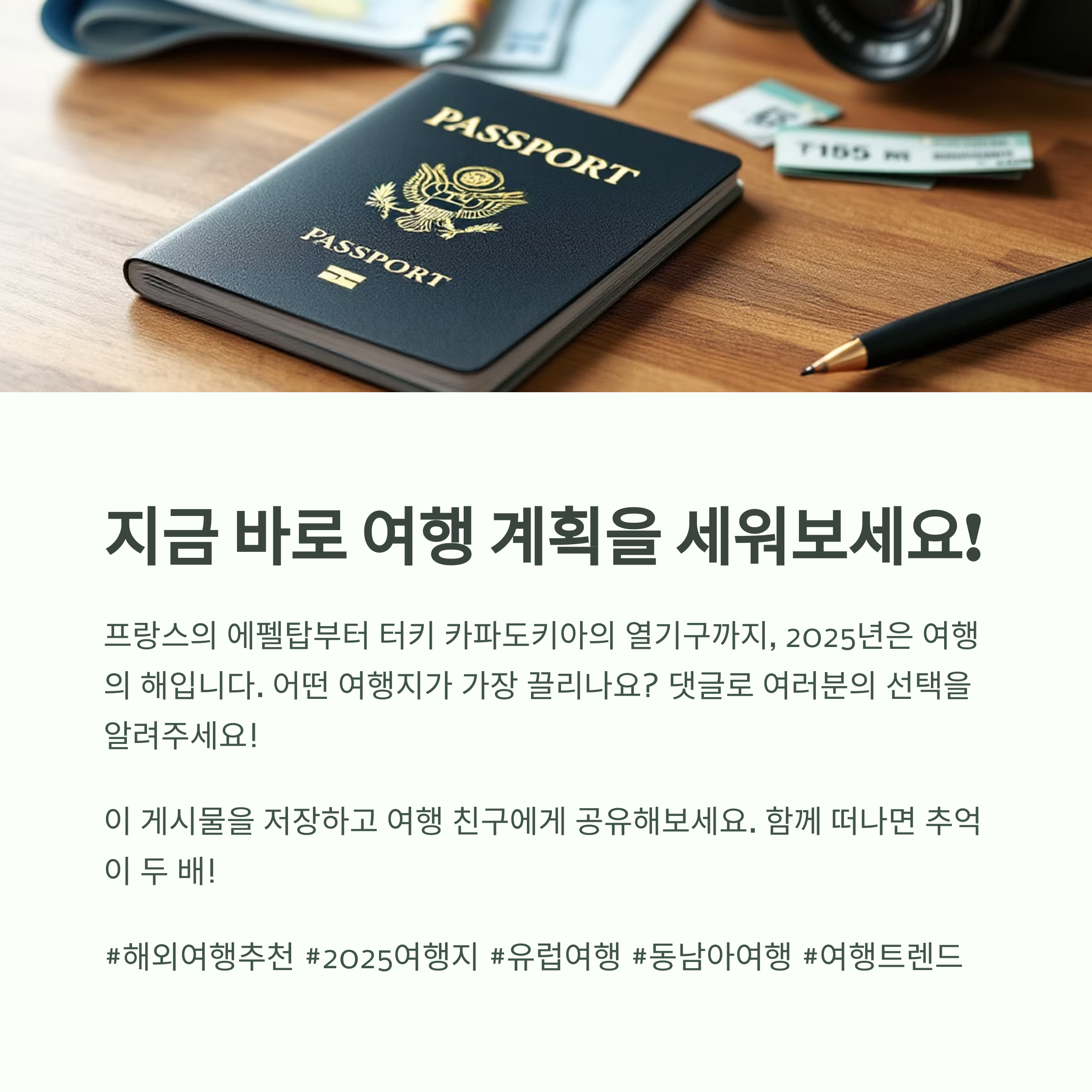2025년은 코로나 이후 완전히 회복된 글로벌 여행시장 덕분에 전 세계가 다시 여행자들을 반기고 있습니다. 유럽부터 동남아, 오세아니아까지 각국은 저마다의 매력을 뽐내고 있으며, 트렌드에 맞춘 여행지를 선택하는 것이 더 중요해졌습니다. 휴양, 문화, 자연, 액티비티 등 테마별로 엄선한 10개국 추천 리스트를 소개합니다. 지금이 아니면 경험할 수 없는 특별한 여행지, 올해 꼭 도전해 보세요.