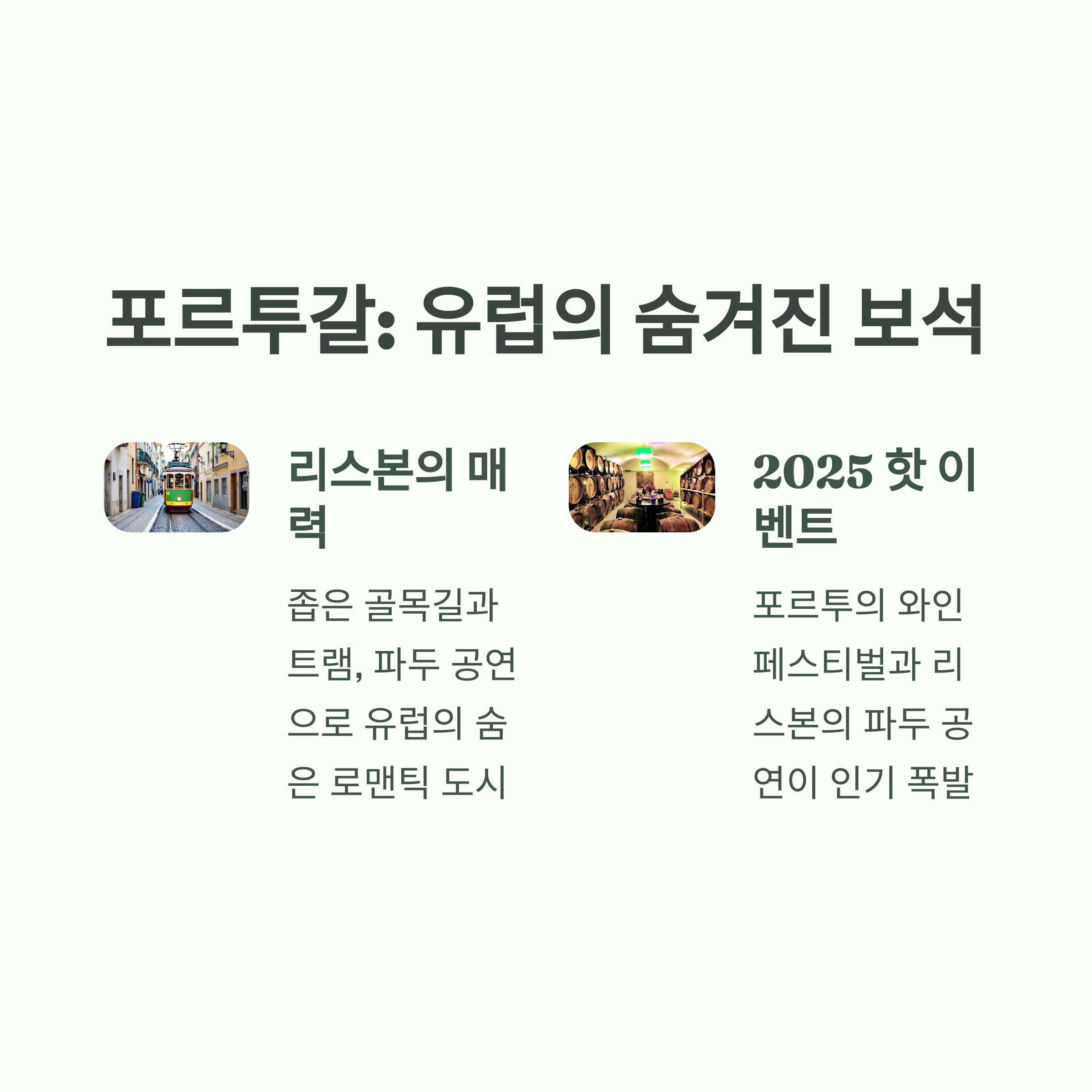 2025년에는 포르투의 와인 페스티벌과 리스본의 파두 공연이 뜨거운 인기를 얻고 있습니다.