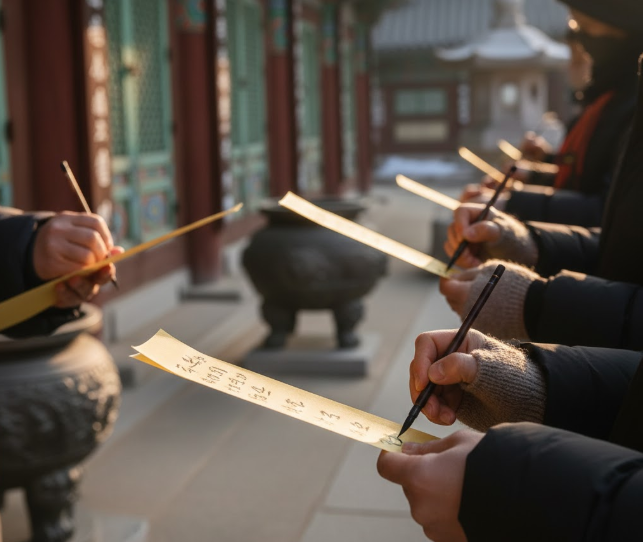 향일암 일출공원에 모인 사람들이 소원지를 적고 있는 모습