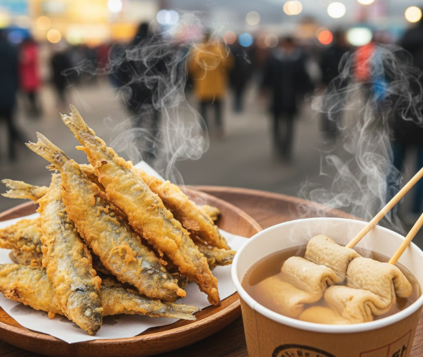 맛있게 튀겨진 빙어 튀김 접시와 어묵탕