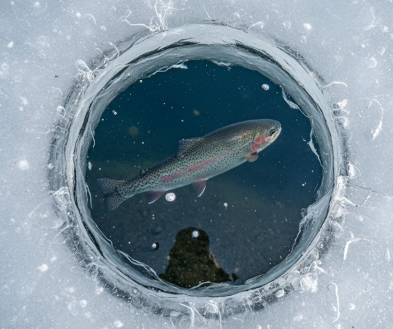 얼음 구멍 사이로 송어들이 휙휙 지나가는 게