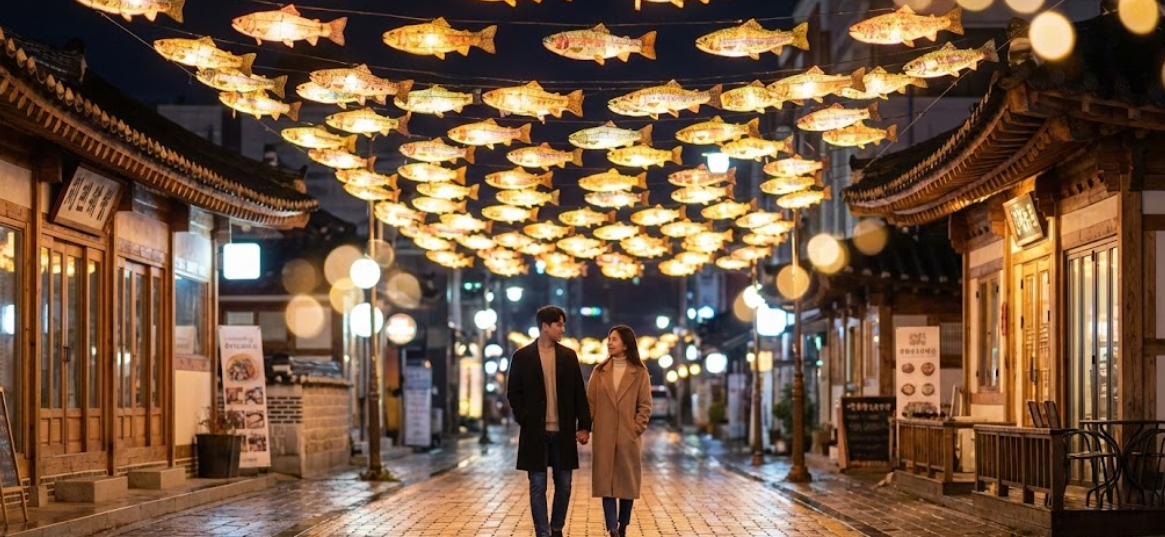 밤하늘을 수놓은 선등거리의 화려한 등불 아래 걷는 연인들