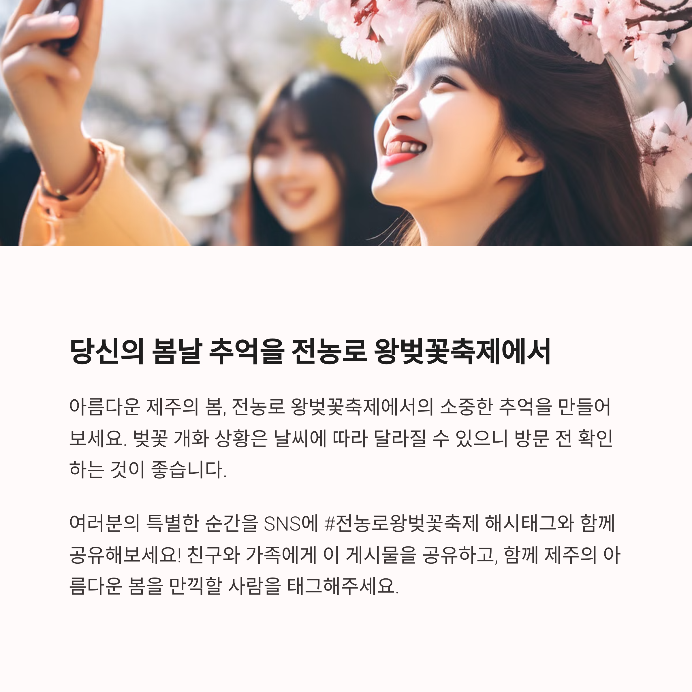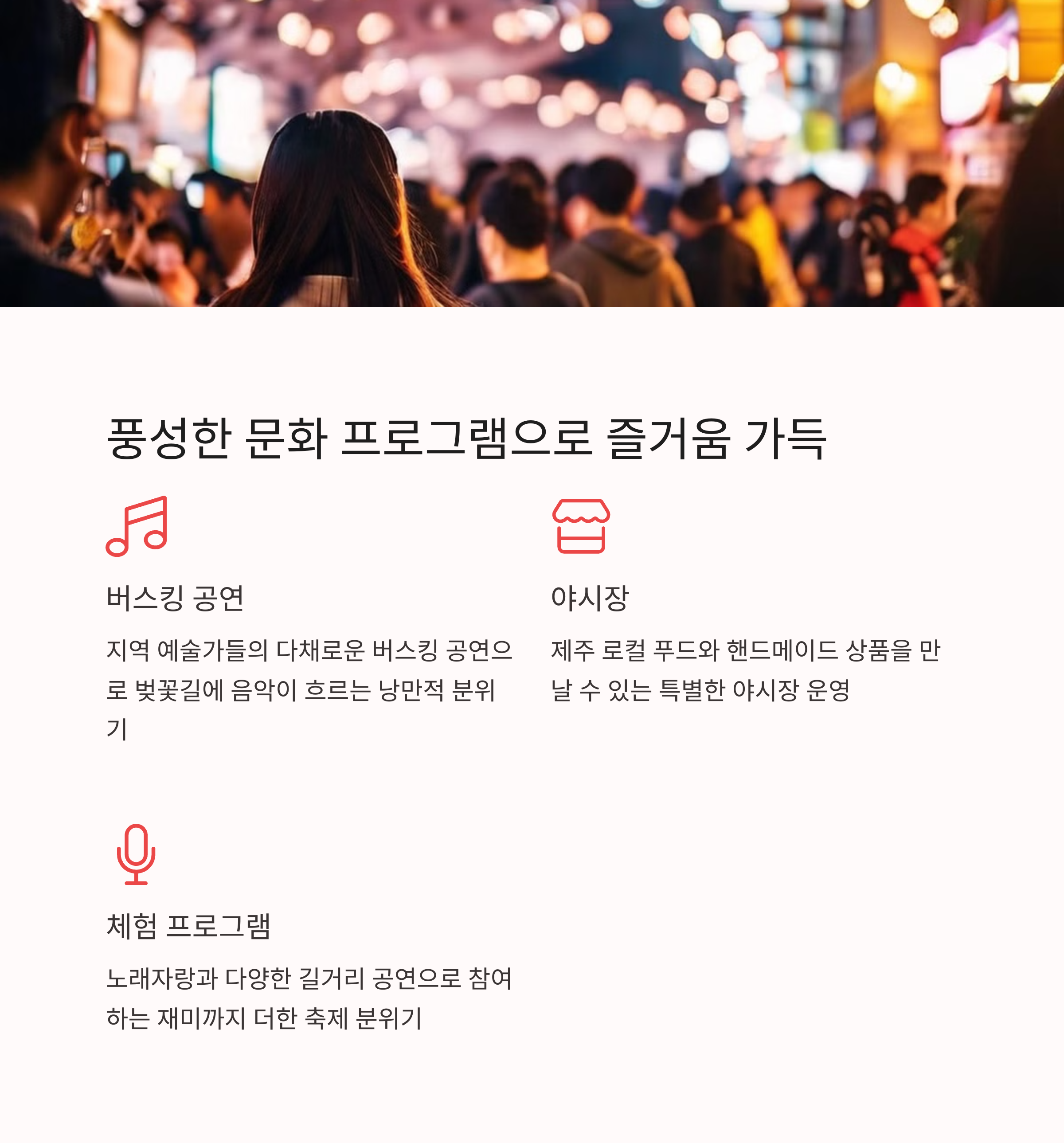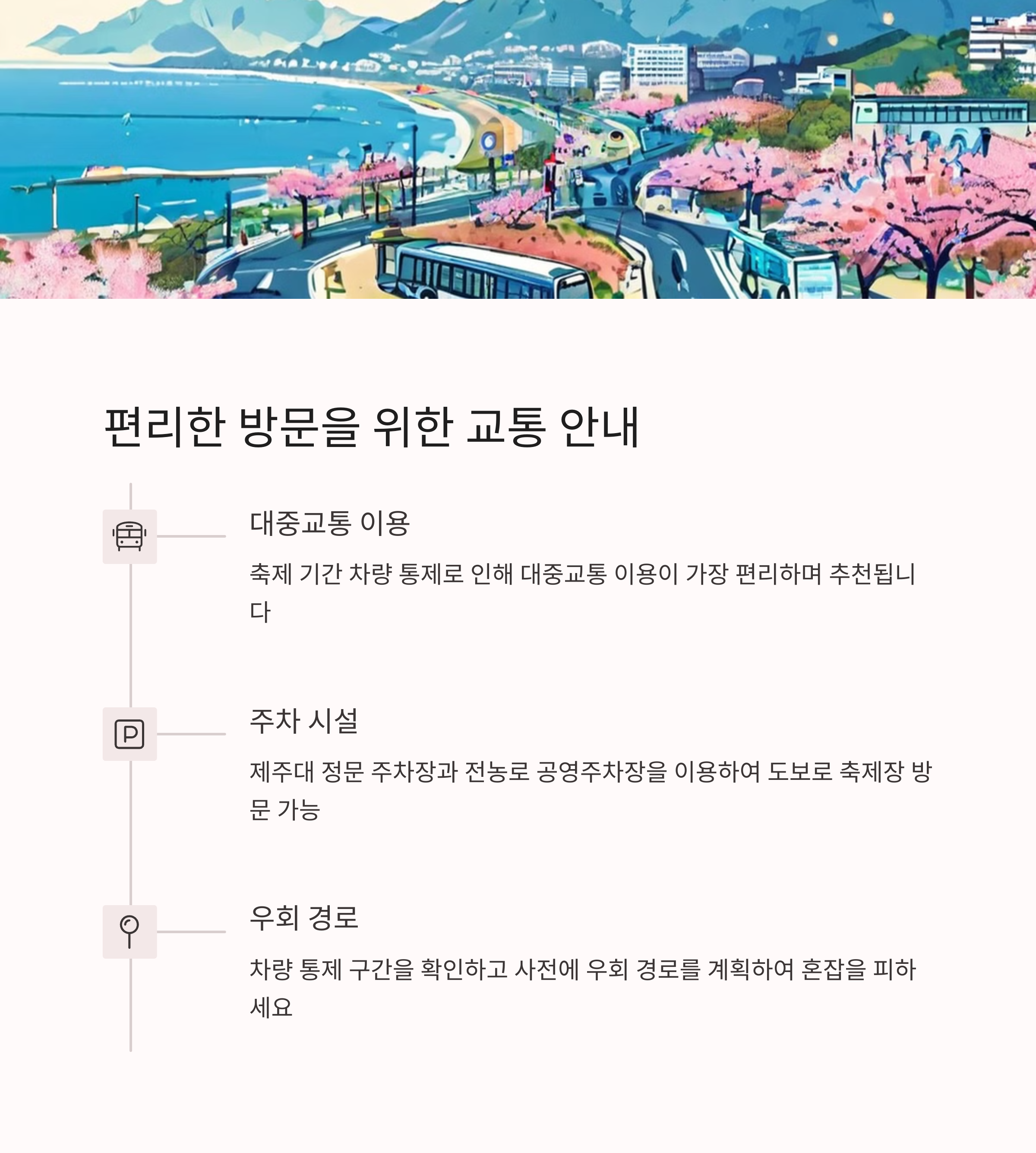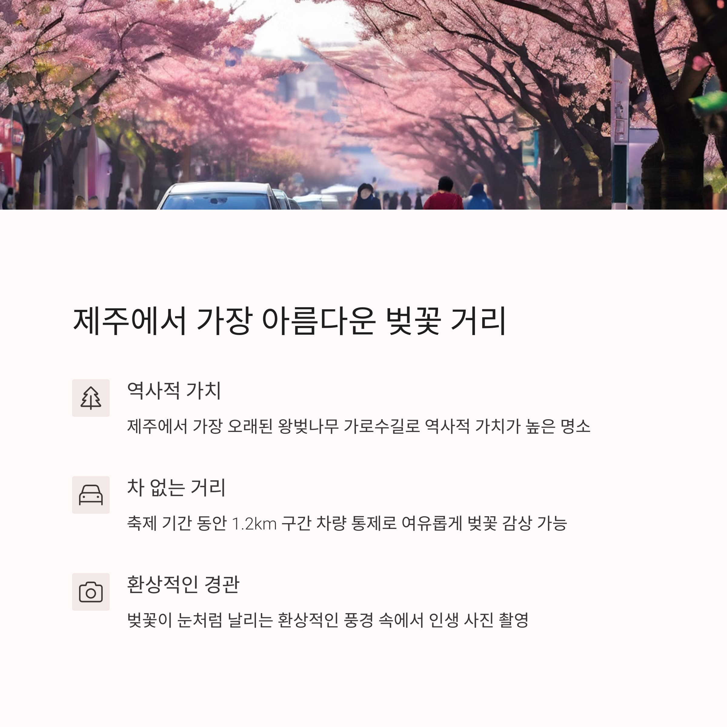 | 제주 대표 봄 축제로 전농로 벚꽃길이 유명 | 전농로 공영주차장과 제주대 주차장 추천 | 가족, 친구, 연인과 함께 떠나는 봄 나들이 |