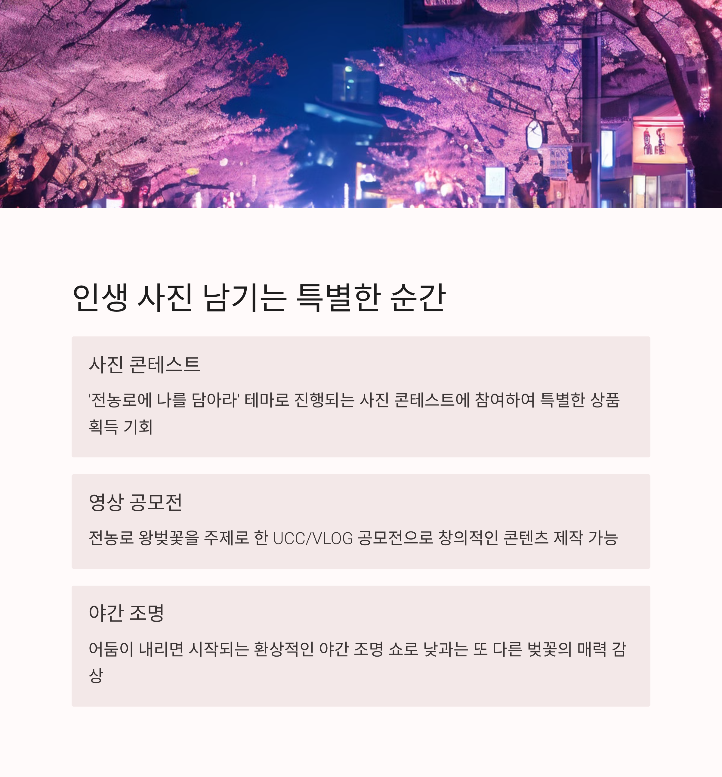 | 도보 산책, 야간 조명, 포토존 등 즐길 거리 가득 | 이른 시간 방문 시 원활한 이동 가능 | 봄바람과 벚꽃이 어우러진 힐링 코스 |