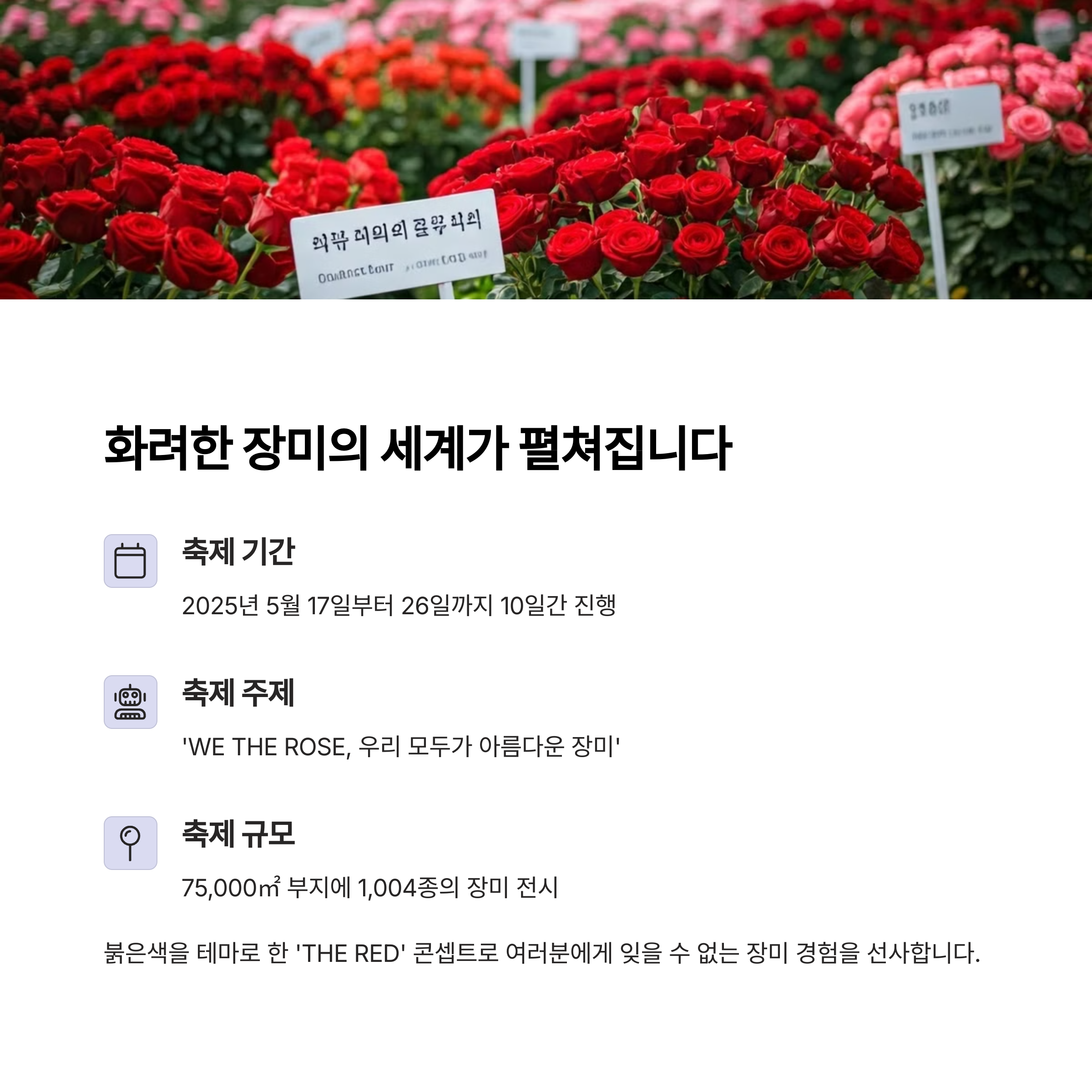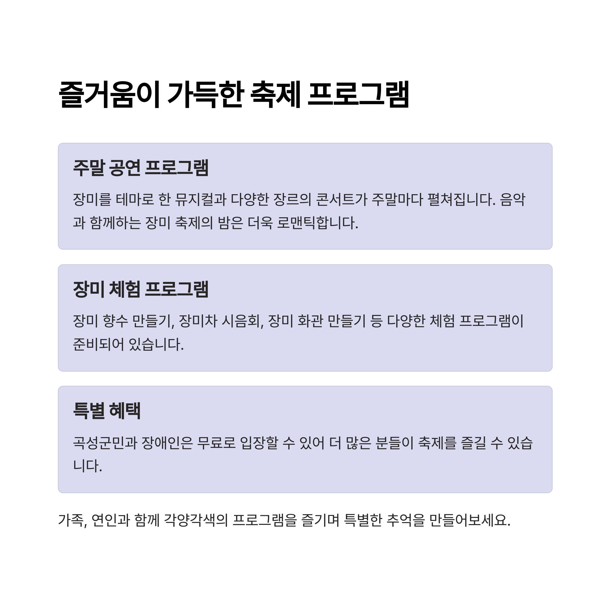 | 뮤지컬, 로즈 콘서트 | 장미꽃 대형 전시 | DIY 장미 체험 | 유료 (군민 & 국가유공자 무료) |