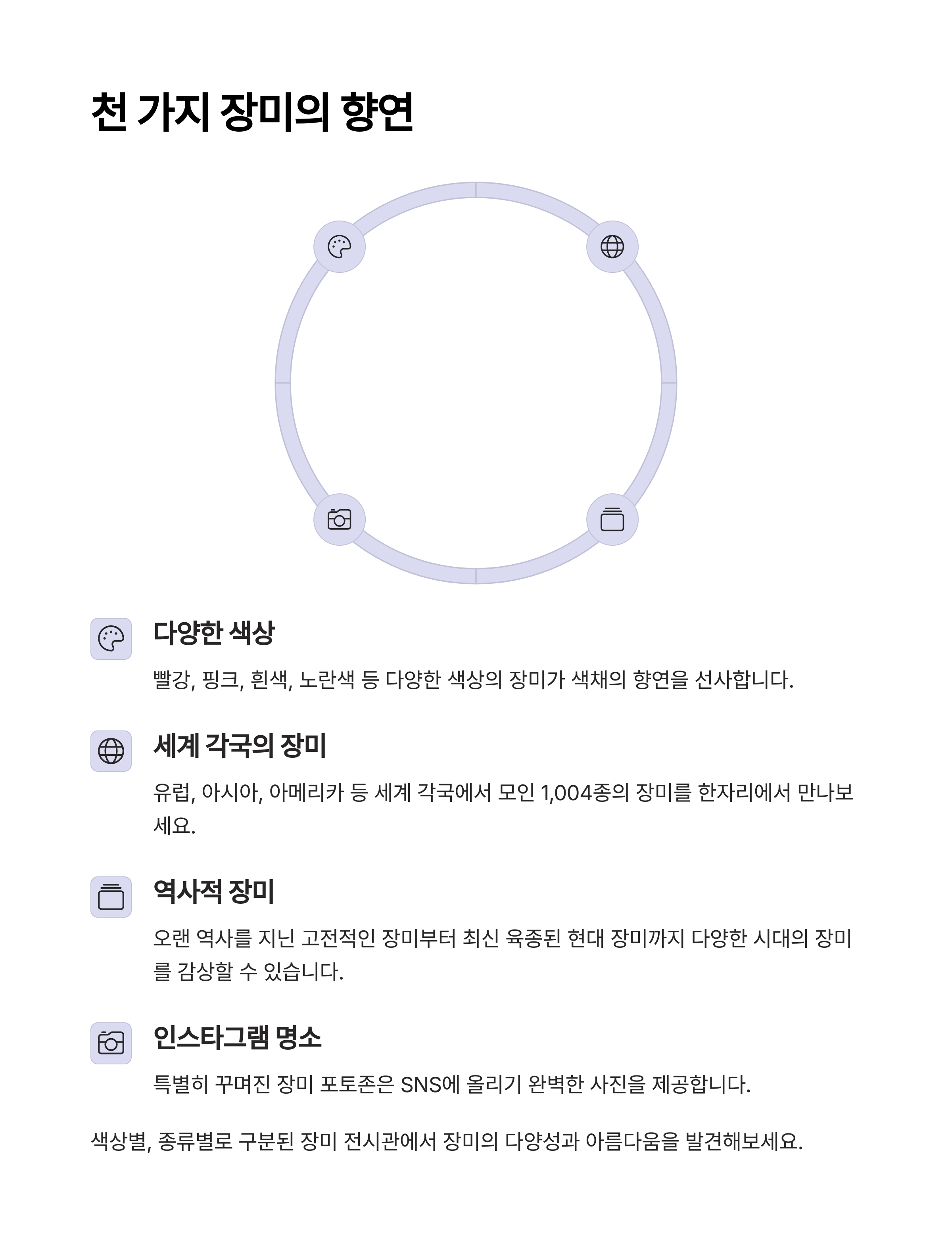 1004종의 다양한 장미가 전시되며, 희귀 품종도 함께 만나볼 수 있습니다.