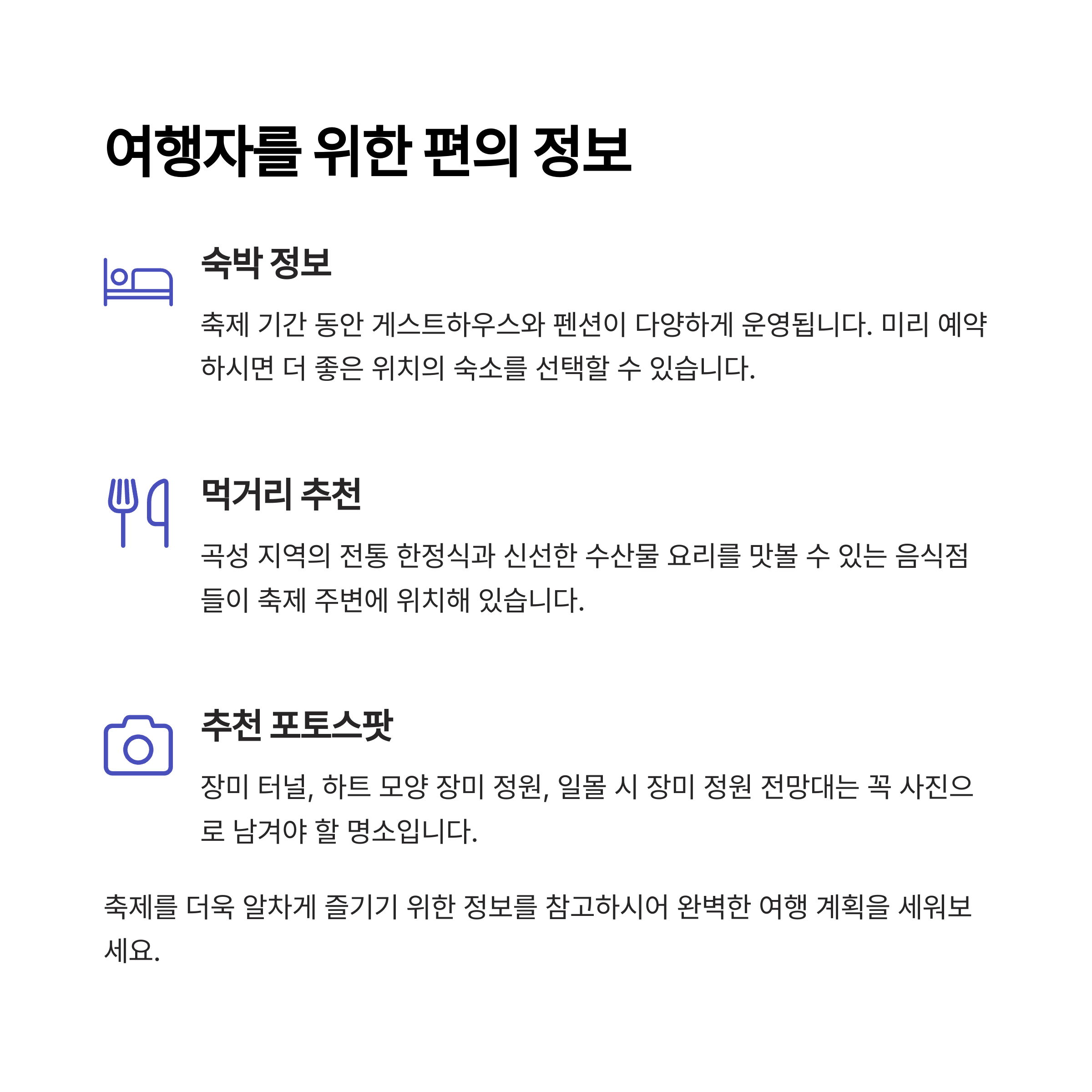 | 곡성 세계장미축제는 가족 모두가 즐길 수 있는 축제입니다. 다양한 장미와 아름다운 정원은 아이들에게도 좋은 자연 공부 기회입니다. 어른들은 문화예술 공연과 힐링 프로그램을 즐길 수 있습니다. 또한 아이들을 위한 DIY 장미 체험 프로그램도 제공되어 있습니다. 가족 모두가 참여 가능한 이벤트와 포토존도 마련되어 있어 더욱 풍족한 시간을 누릴 수 있어요. |