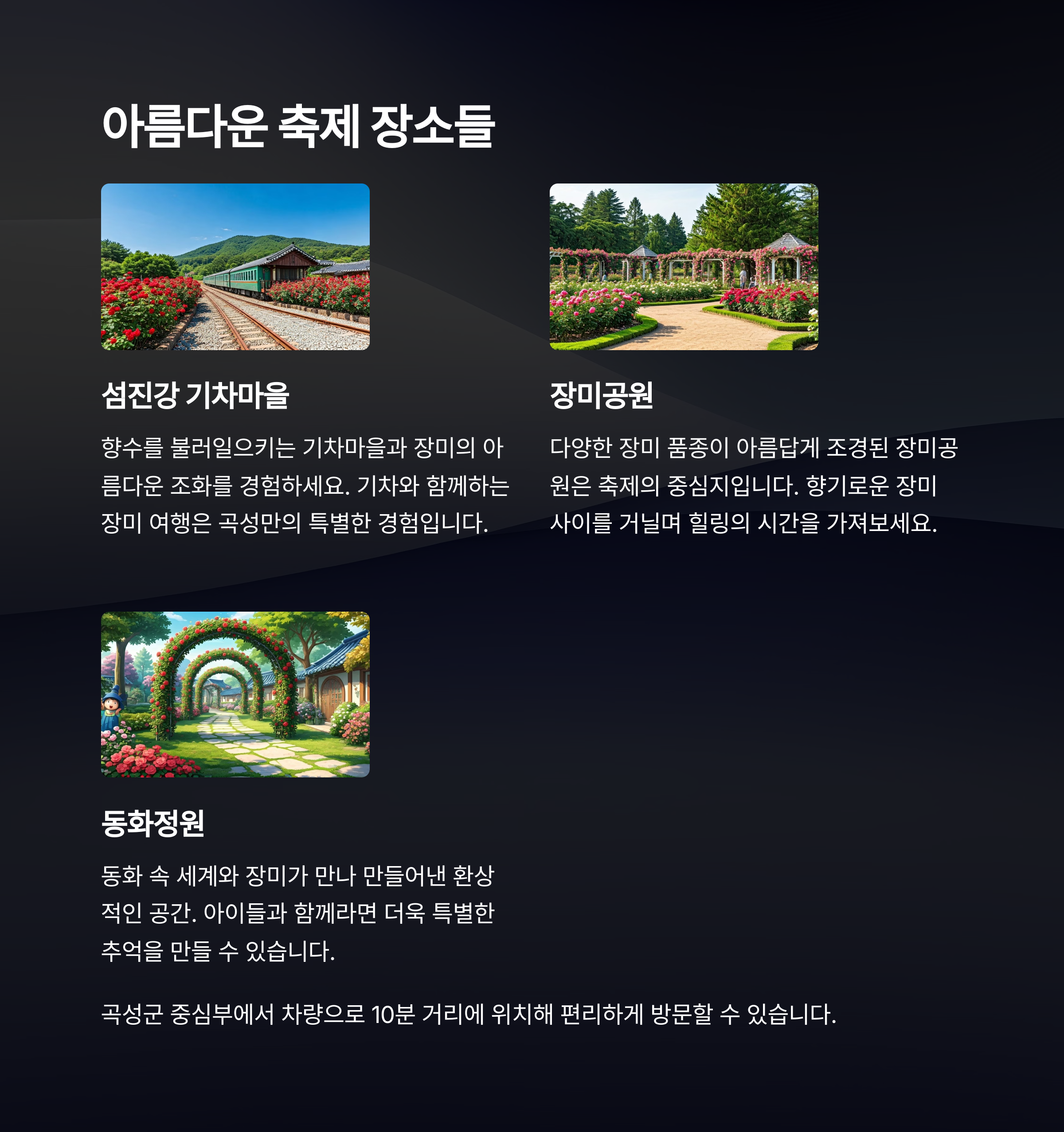 | 곡성 세계장미축제에서 반드시 봐야 할 장소는 섬진강 기차마을입니다. 섬진강 기차마을은 곡성의 랜드마크이자 장미축제의 중심지입니다. 장미공원과 동화정원, 그리고 곡성천 뚝방길에서는 환상적인 사진 촬영이 가능합니다. 특히 'THE RED' 콘셉트로 꾸며진 메인 장미광장은 놓칠 수 없는 포인트입니다. 다양한 야외 공연과 축제 분위기를 만끽할 수 있는 구간들이 조성되어 있습니다. |