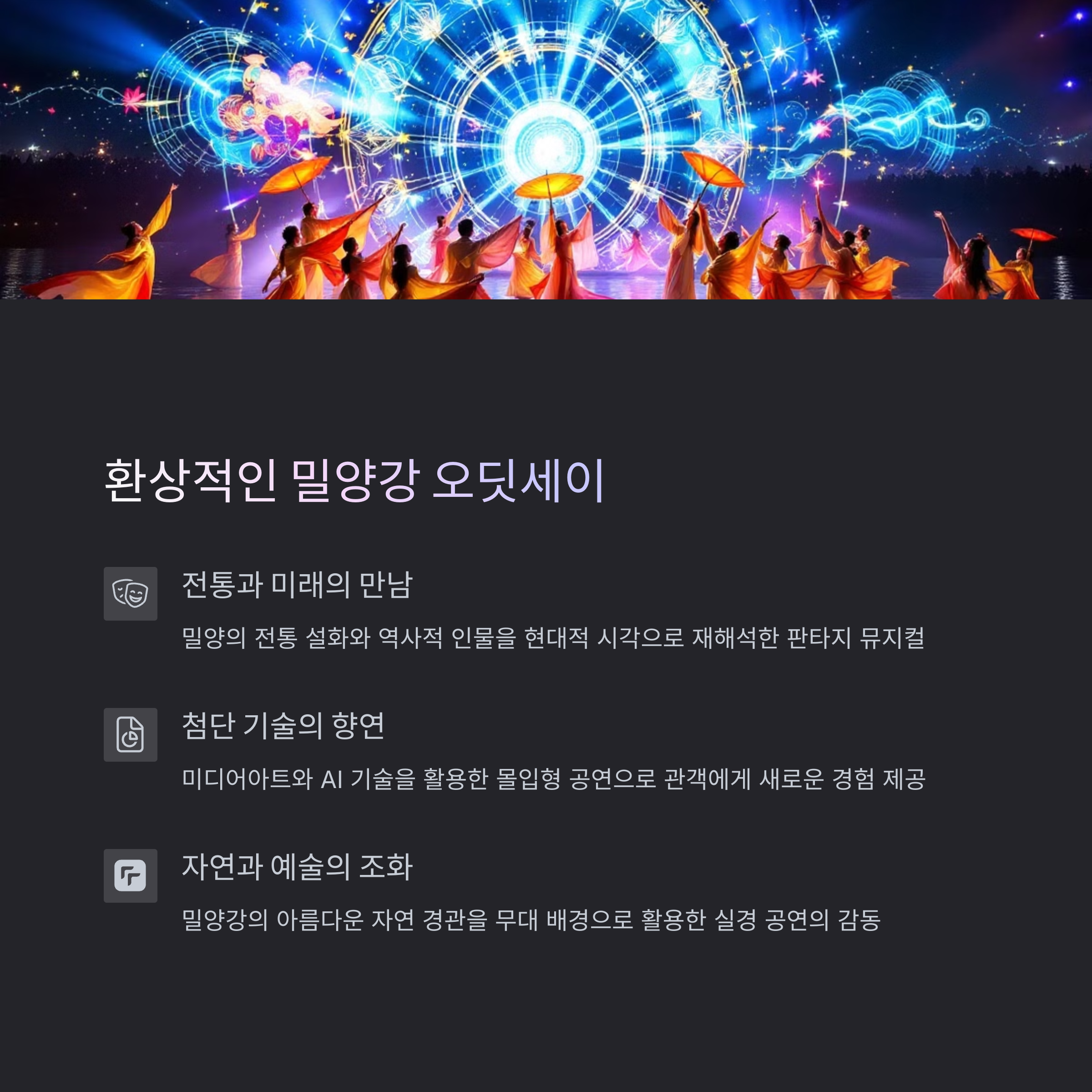 | 밀양강 오딧세이는 국내 최장수 실경공연으로, 매우 독창적인 프로그램입니다. 전통 설화와 역사적 인물을 활용한 스토리텔링 기반의 내용이 특징입니다. 최신 기술인 미디어아트와 AI 인터랙티브 기술의 활용으로 무대 연출이 돋보입니다. 전통과 현대 예술의 융합이 이루어지는 창작 판타지 뮤지컬입니다. 국보 영남루와 밀양강의 자연 경관을 실경으로 사용하여 몰입감을 제공합니다. |