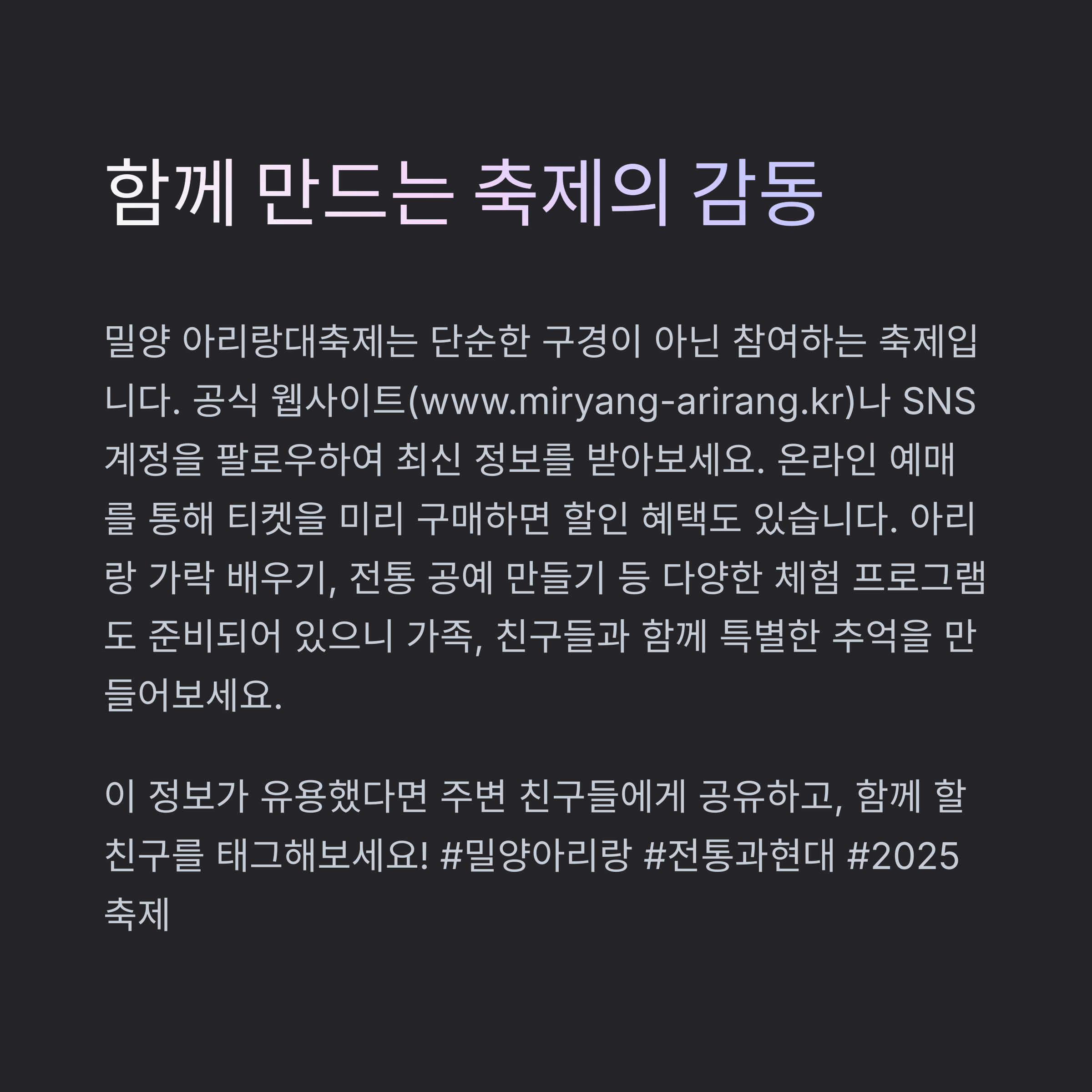 안녕하세요, 맛길작가입니다. 오늘은 밀양 아리랑대축제라는 멋진 전통음악 축제를 소개하려고 합니다.