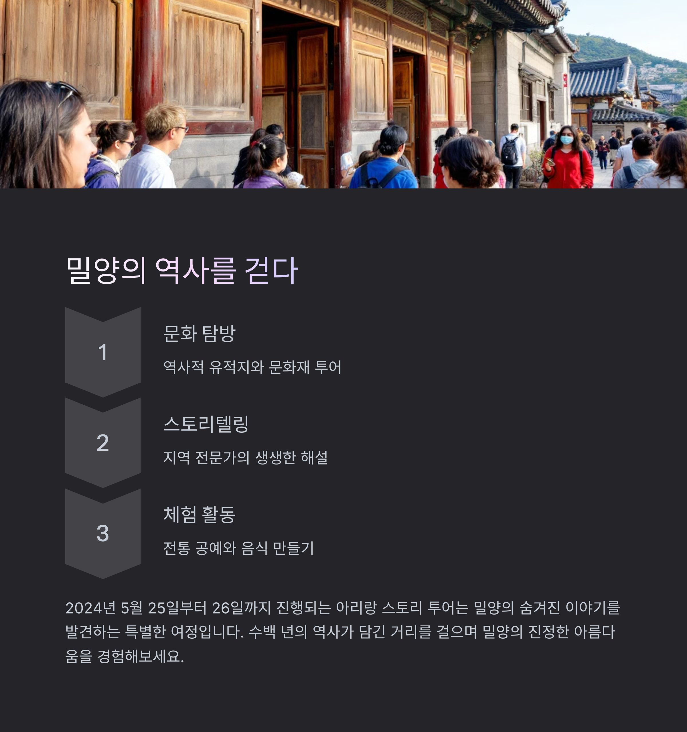 또한, 아리랑 스토리 투어도 놓칠 수 없는 프로그램 중 하나입니다. 이 투어는 역사적인 장소와 전통시장을 탐방하며, 밀양의 문화와 역사를 생생히 체험할 기회를 제공합니다. 밀양강 오딧세이 공연은 화려한 무대 효과와 조화를 이룬 전통 음악의 선율로 분위기를 한층 돋우며, 가족 단위 방문객들에게도 큰 호응을 받고 있습니다. 아리랑 스토리 투어는 영남루에서 시작해 밀양아리랑시장과 해천항일운동테마거리를 거친 후, 다시 영남루로 돌아오는 코스로 짜여 있습니다.