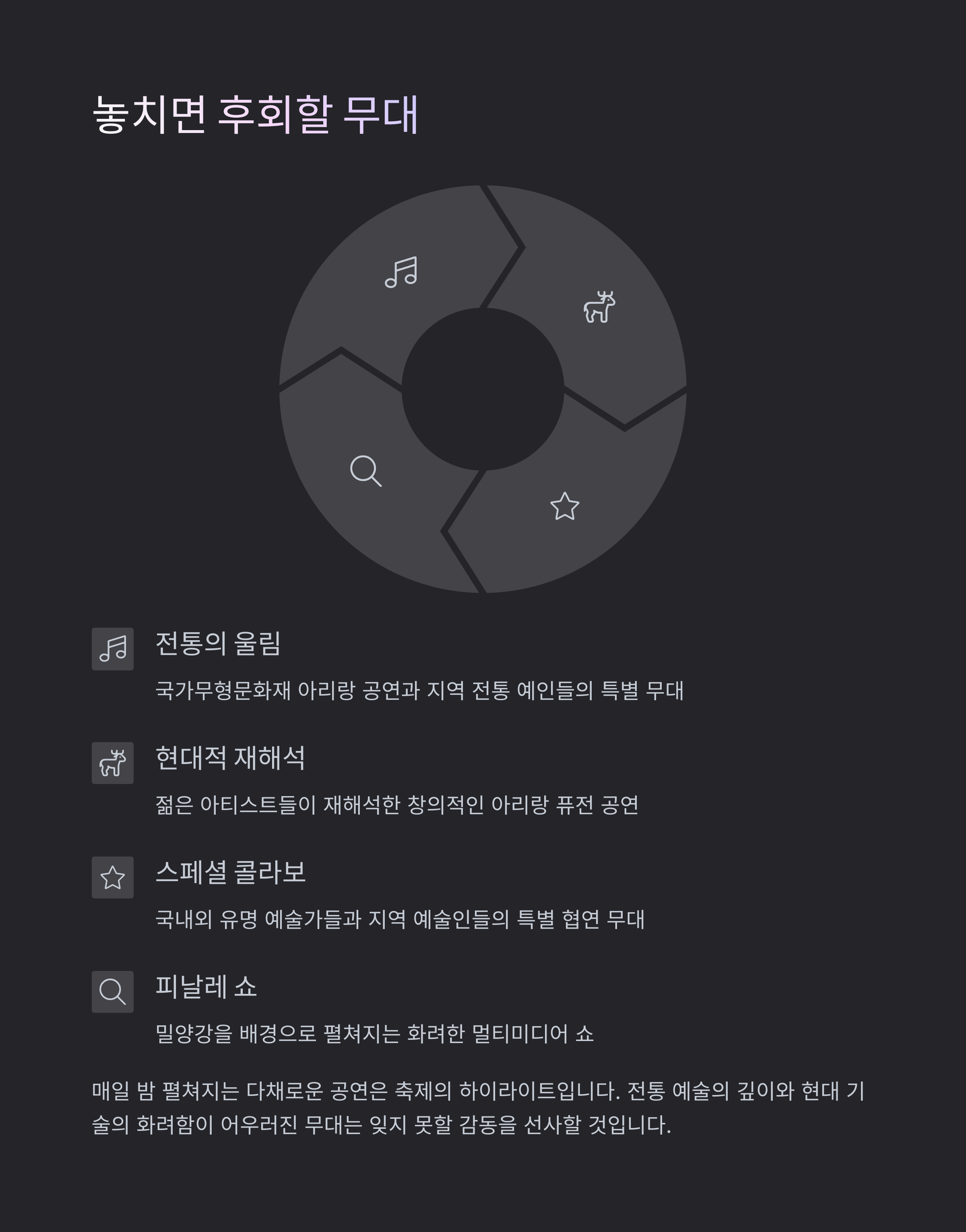밀양 아리랑대축제는 단순한 지역 축제를 넘어 전통과 현대의 융합을 보여주는 사례입니다.