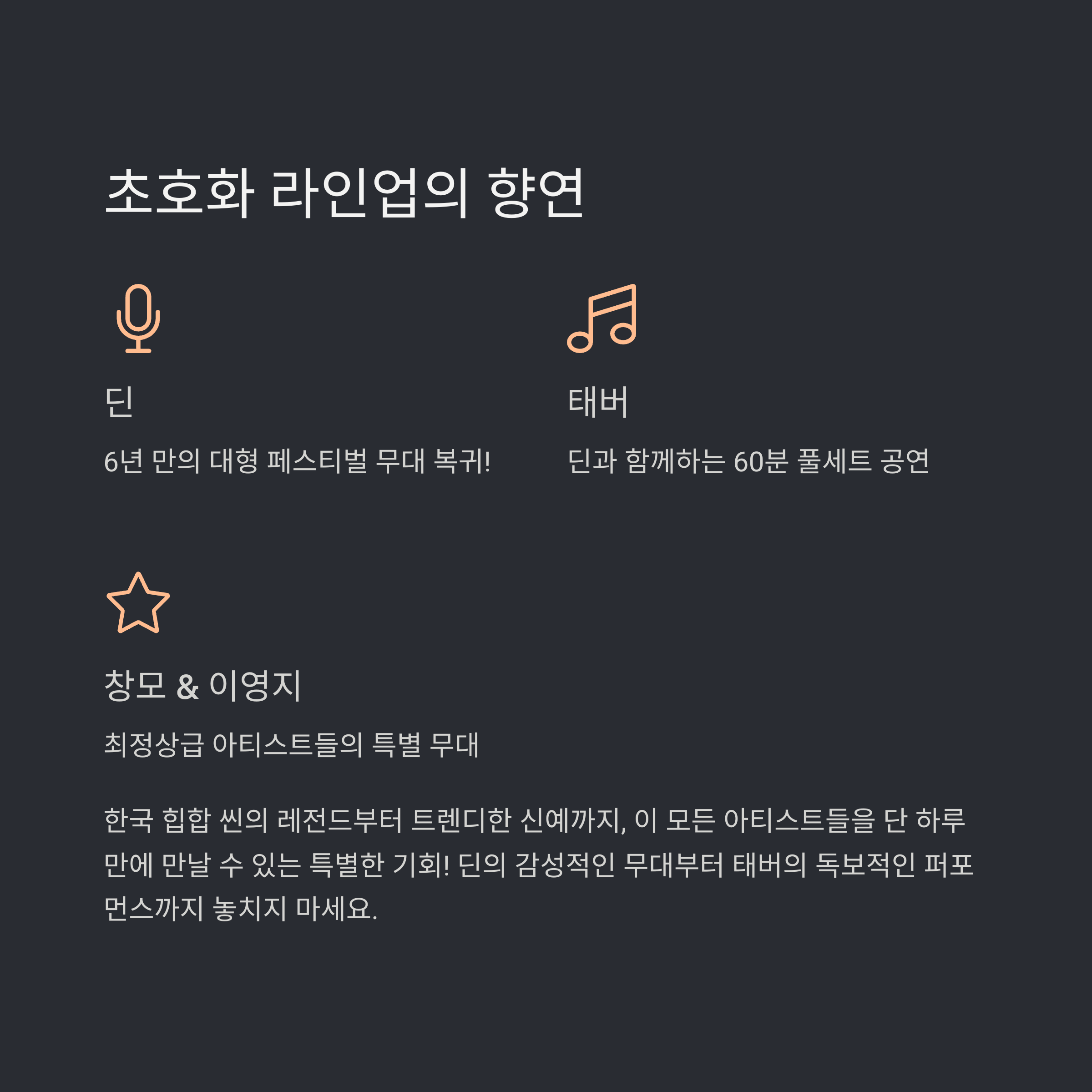 | 가장 주목할 만한 무대는 딘(DEAN)의 6년 만의 복귀 무대입니다. 팬들이 오래 기다려온 딘의 풀세트 공연은 단연 하이라이트입니다. 이와 함께 태버(TAEBAE)가 협연하며 인상적인 무대를 선사합니다. 실력파 래퍼 창모(IN2IT)와 이영지의 새로운 퍼포먼스 역시 기대감을 높입니다. 각각의 아티스트가 다양한 매력을 보여주는 독창적인 무대를 확인해보세요. |